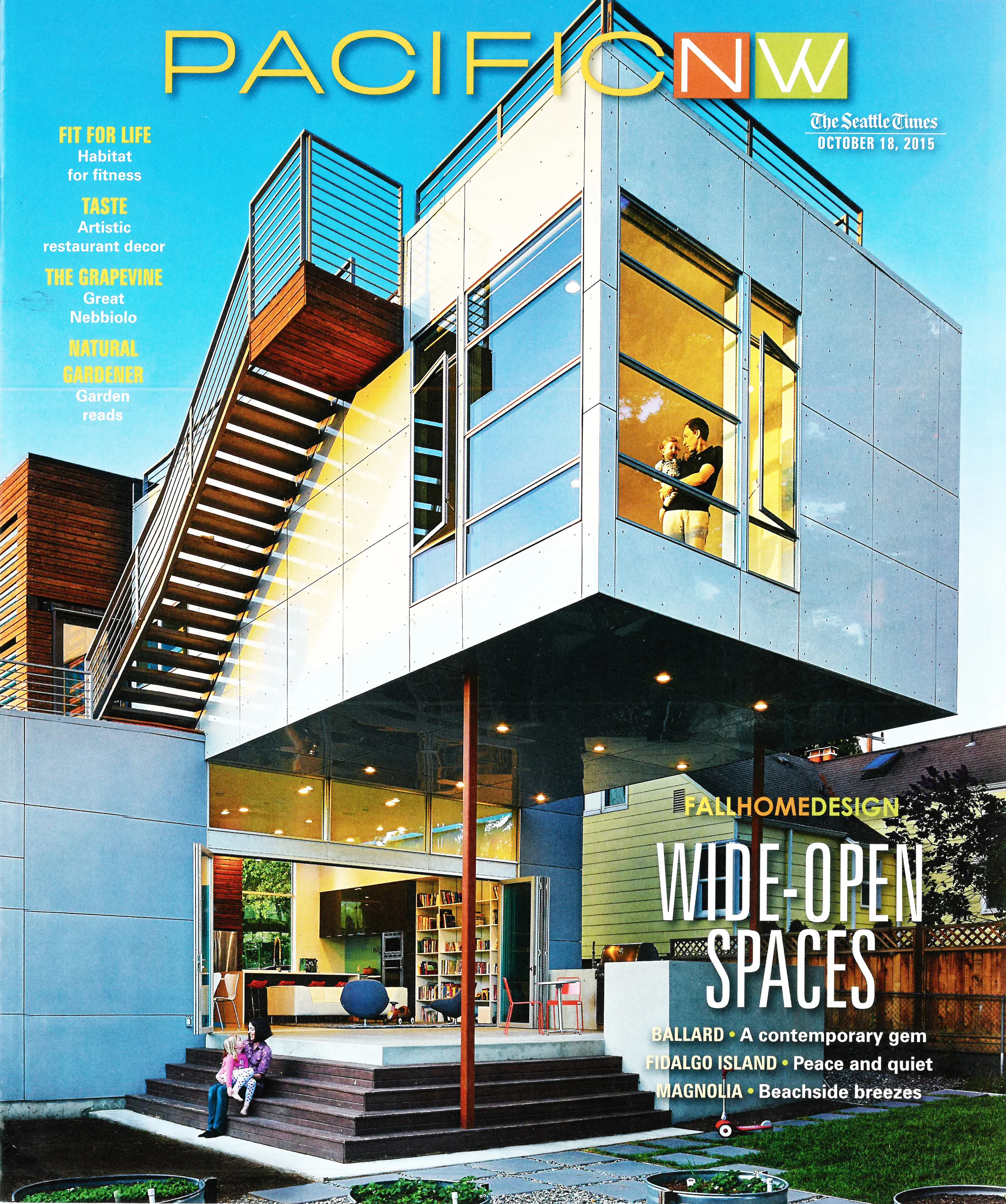 "We are seated in the living room; it's a small-tall space with a blackened-steel fireplace and two walls of glass that, in the foreground, overlooks the meadow that is Herman's yard and, off in the distance, takes in dreamy island-water views in sapphire and emerald." - Rebecca Teagarden
